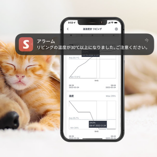 設定した温度・湿度を超えると外出先でも通知を受信できます。