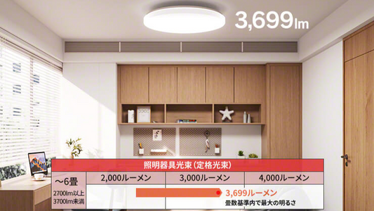 スイッチボットシーリングライトプロの明るさは、日本照明工業会が定める適用畳数の表示基準の上限値3,699ルーメン。