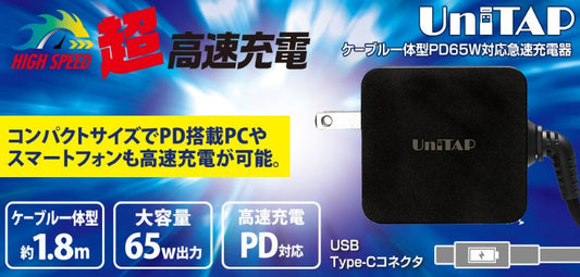 【PRINCETON】Unitap ケーブル一体型 PD65W対応 超急速充電器 ブラック PD3.0対応 USB type-c 1ポート PPS-PD65C